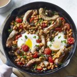- Heat an ovenproof frying pan on the hob until just hot, then add the oil, onion, and red pepper and fry for 2 minutes.