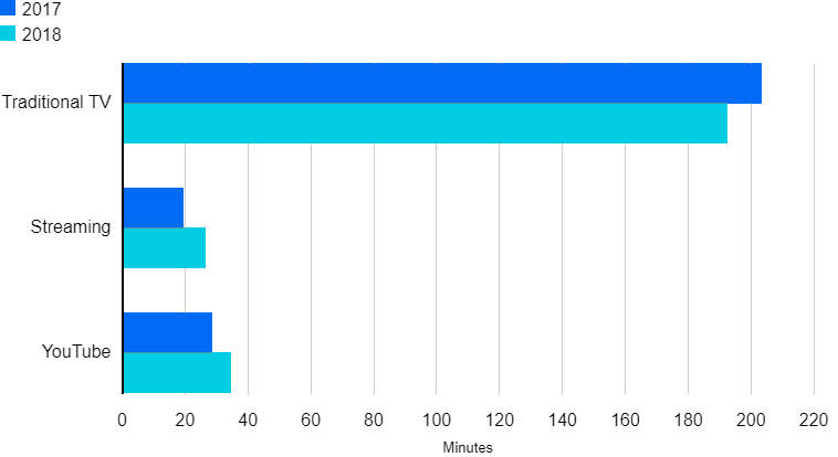 On average people in the UK watch 3 hours and 12 minutes of traditional TV which is 11 minutes less than last year. People ages 65-74 years old spend on average 5 hours and 33 minutes watching traditional TV per day this in in comparison to 16-24 year olds who are only spending 1 hour 25 minutes watching traditional TV.