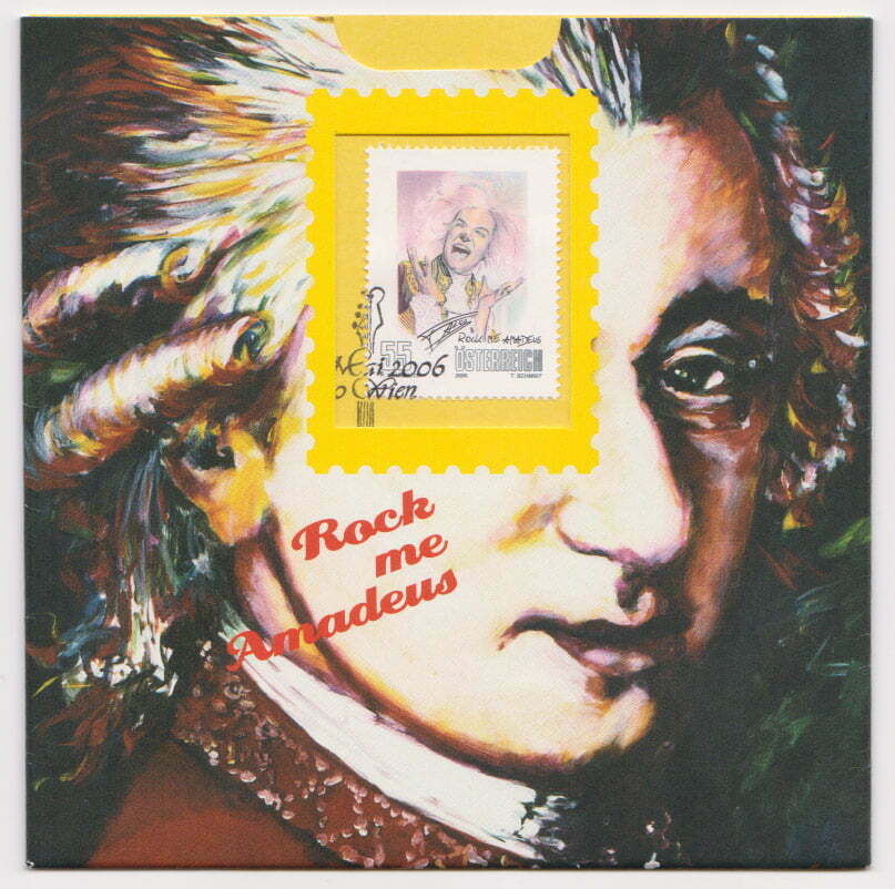 A special set of seven sleeved stamped cards that were issued to celebrate the 250th anniversary of the birth of Mozart. This is the full collection minus the music CD