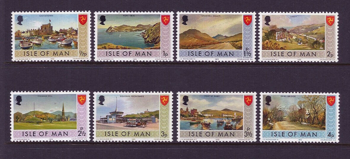 All of the above values were issued on the 5th July 1973 and depict local tourist attractions. All are perf 11.5 and the engraving was undertaken by Swiss firm Courvoisier SA. The images are by local artist J H Nicholson and the 1/2p is particularly interesting as it depicts the harbour in Castletown. This was the capital of the Isle of Man until 1869 and was captured 3 times by Robert The Bruce!
